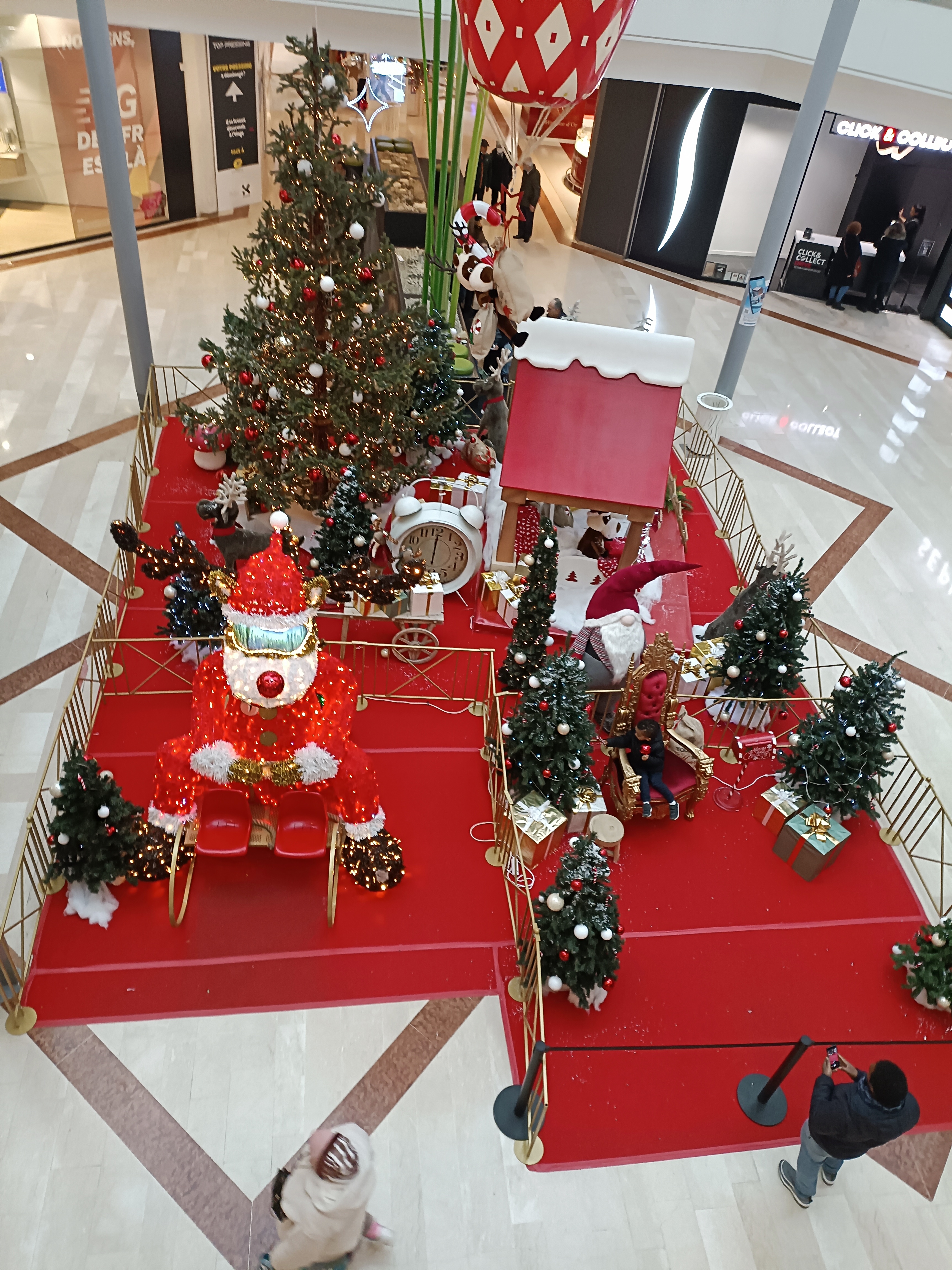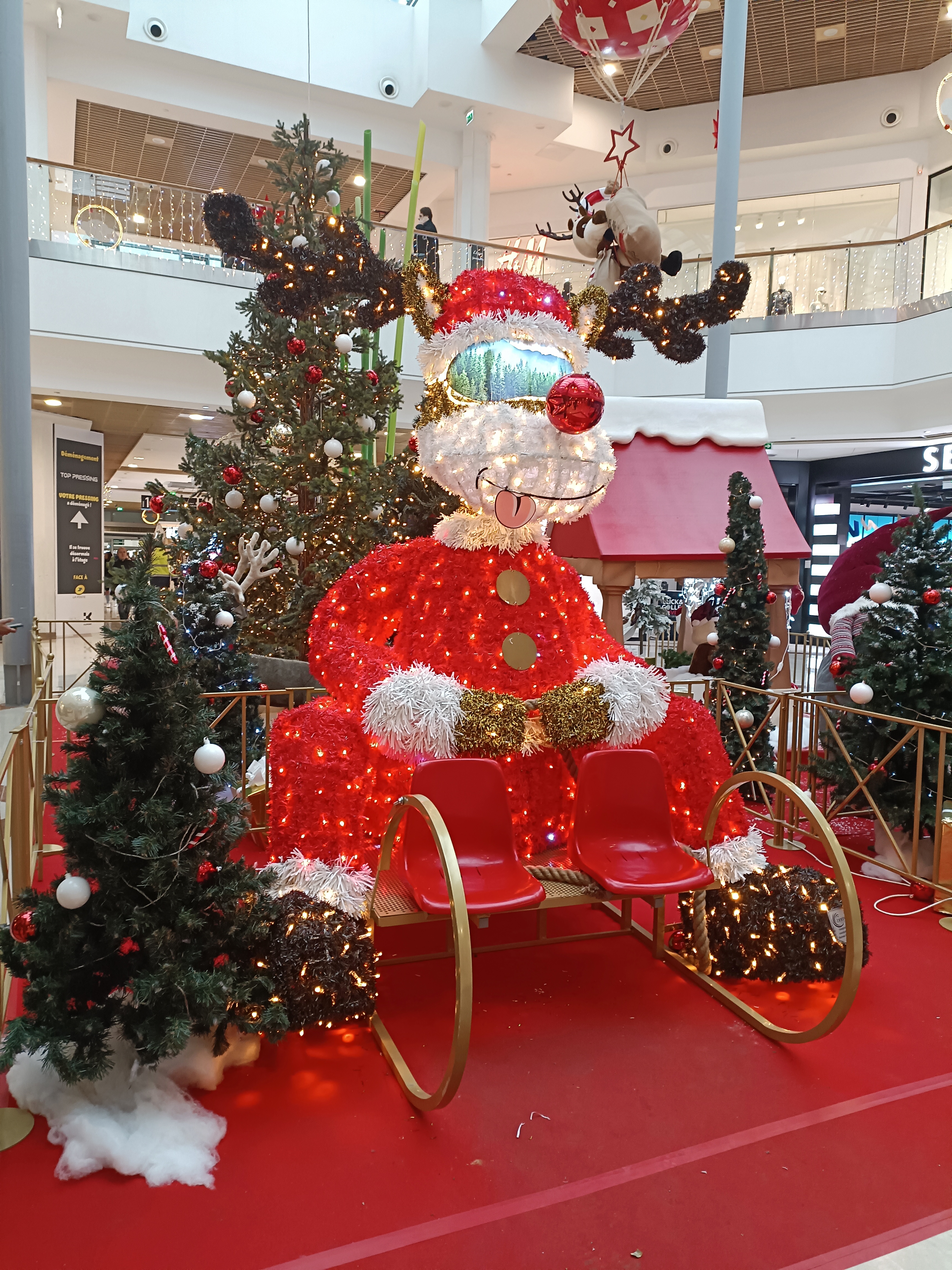 Centre commercial avec beaucoup de boutiques, un grand Carrefour et des activités pour les enfants. A Noël, décorations, sapin et photos avec Père Noël