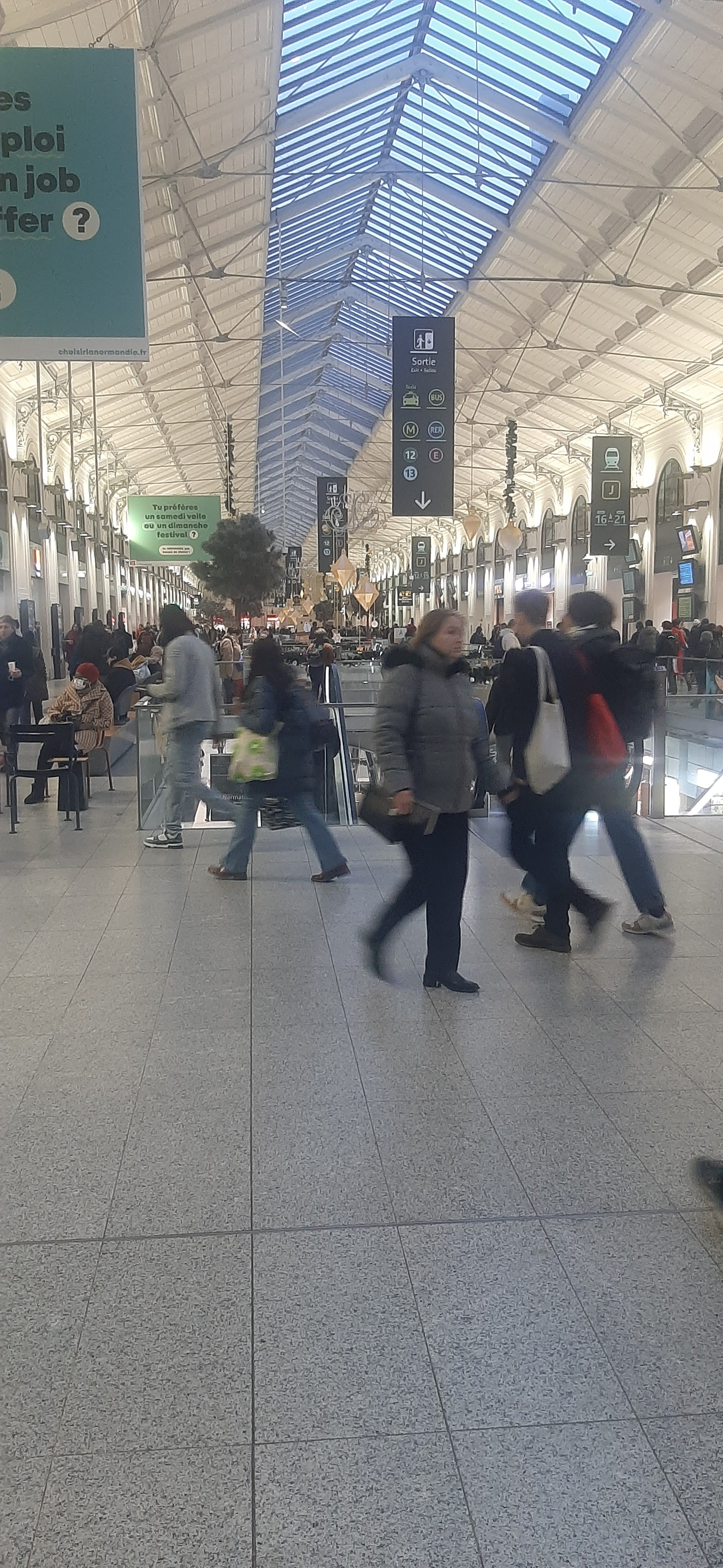 La gare est un gros carrefour et c'est un peu désagréable quand il y a du monde. Pour les trains grandes lignes, on est souvent bloqués par les gens qui attendent devant les panneaux que le quai du train qu'ils souhaitent prendre soit annoncé. Lorsqu'on regarde les panneaux de l'autre côté, on a la lumière en pleine figure et ça gêne. C'est un peu mal indiqué pour aller vers la station Auber quand on sort pour une correspondance là-bas.