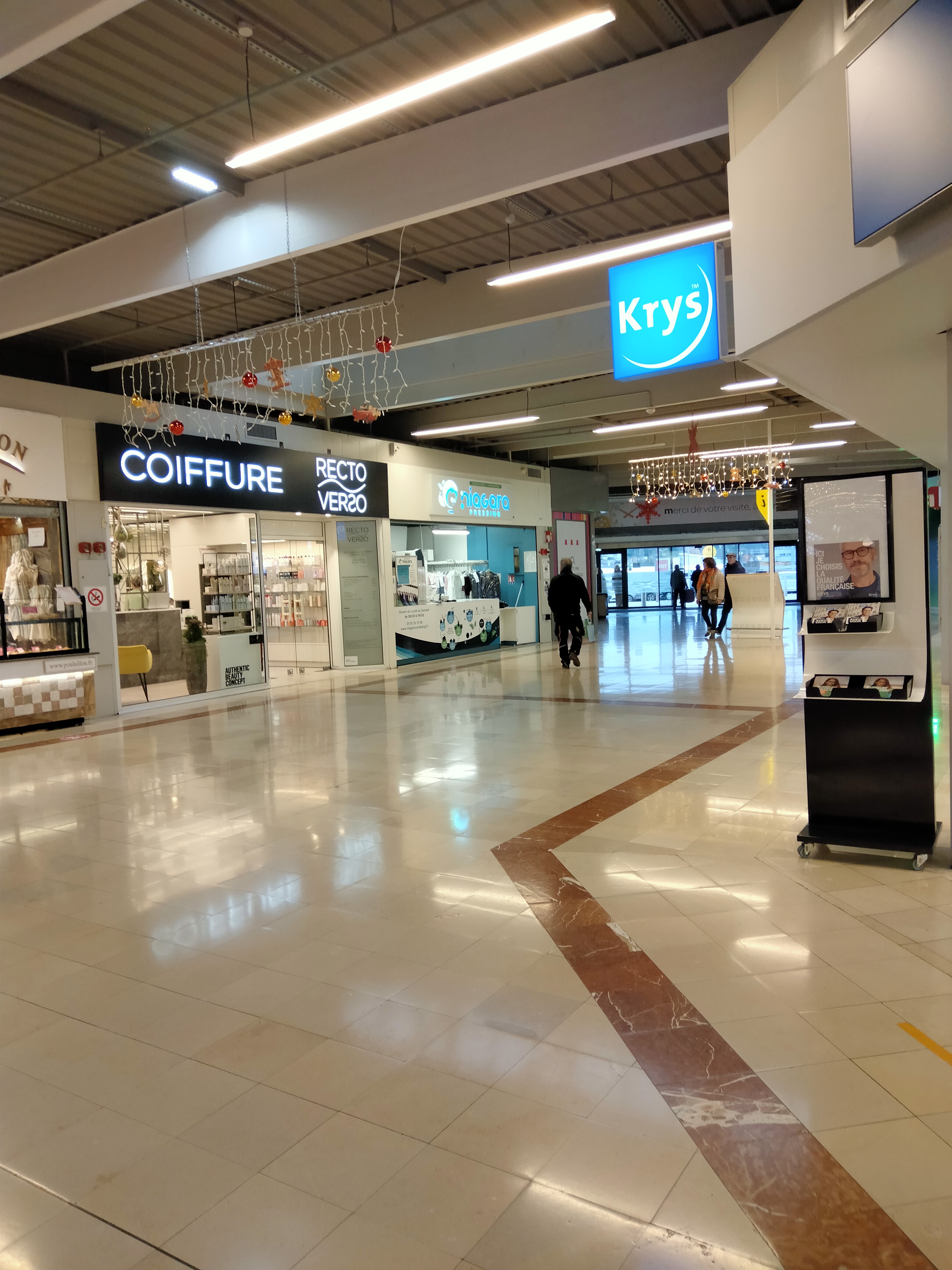 Beaucoup de magasins fermés Carrefour pas très propre, caissières pas toujours très aimables, professionnelles. Souvent erreurs de prix. Bien contrôler ses notes. Il n'y a que des coiffeurs et des opticiens et bijoux manque de diversité
