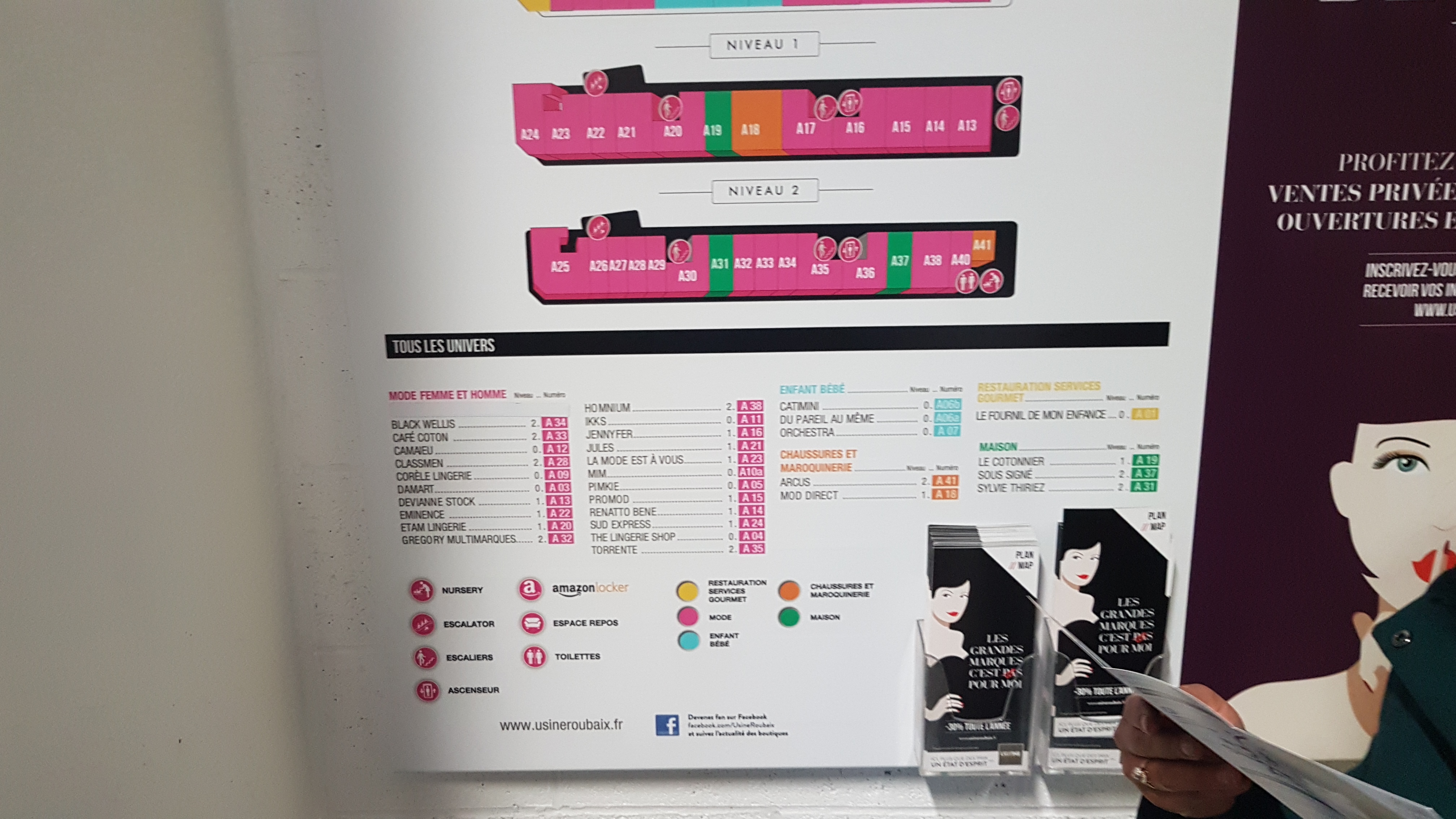 Enseignes Nike, Adidas (le personnel et le manager sont au petit soin et très sympathiques), Triumph, Damart, Lee Cooper, Orchestra, Camaïeu, Galeries Lafayette.... On ne peut faire que des affaires à-30,50%, je recommande vivement. Il y a des ascenseurs, pour monter les 2 étages (pmr), toilettes...